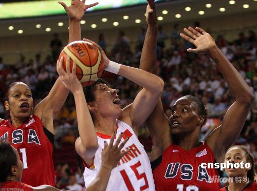 8月11日晚,北京奧運(yùn)會(huì)女子籃球中國(guó)隊(duì)與美國(guó)之戰(zhàn)在五棵松籃球館舉行,一心要奪取獎(jiǎng)牌的中國(guó)女籃以63-108慘敗給美國(guó)隊(duì)。中新社發(fā) 任晨鳴 攝