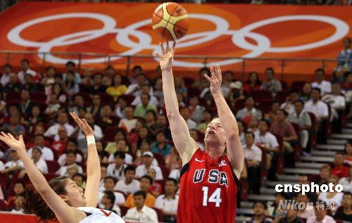 圖為美國(guó)隊(duì)14號(hào)SMITH Katie突破中國(guó)隊(duì)防線(xiàn)投籃。