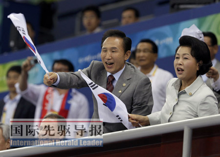 8月9日,李明博夫婦為韓國(guó)女子手球隊(duì)加油。