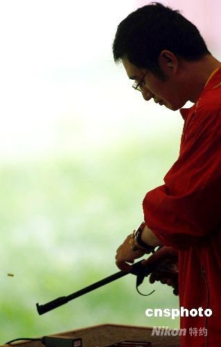 8月12日,北京奧運(yùn)會(huì)男子50米手槍比賽在北京射擊館開戰(zhàn),譚宗亮代表中國射擊隊(duì)出戰(zhàn)并殺入決賽。圖為譚宗亮在比賽中。中新社發(fā) 盛佳鵬 攝