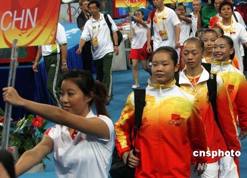 圖:中國隊向女子體操團(tuán)體決賽金牌沖擊
