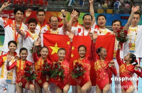 圖:中國(guó)女隊(duì)首奪奧運(yùn)體操女團(tuán)金牌