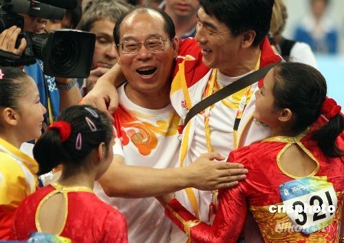8月13日,北京奧運(yùn)會(huì)女子體操團(tuán)體決賽在北京奧林匹克公園內(nèi)的國(guó)家體育館舉行,由程菲、何可欣、江鈺源、李珊珊、楊伊琳、鄧琳琳組成的中國(guó)體操女隊(duì)創(chuàng)造歷史,以總成績(jī)188.900分摘取桂冠,奪得中國(guó)體操歷史上第一枚奧運(yùn)會(huì)女子團(tuán)體金牌。圖為掛上金牌的小姑娘們與中國(guó)體操管理中心主任高健及全體教練合影。中新社發(fā) 任晨鳴 攝