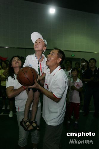 8月14日下午,李寧、楊揚(yáng)和潘曉婷與艾滋孤兒玩起了羽毛球、乒乓球等體育游戲!翱鞓(lè)奧運(yùn)會(huì)”由李寧基金會(huì)發(fā)起,與阜陽(yáng)市艾滋病貧困兒童救助協(xié)會(huì)聯(lián)手,邀請(qǐng)阜陽(yáng)的30名艾滋孤兒來(lái)到北京,觀看了奧運(yùn)會(huì)的射擊比賽,并游覽北京名勝古跡。圖為李寧(右)在教艾滋孤兒打籃球。中新社發(fā) 沈晨 攝