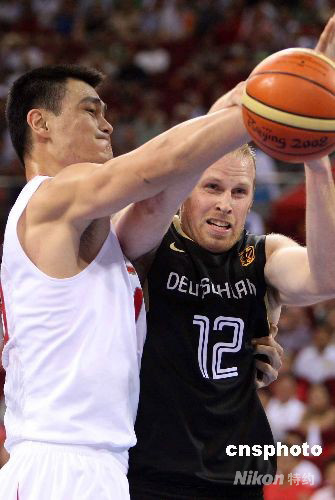 8月16日,北京奧運(yùn)會男子籃球小組賽第四輪比賽在五棵松籃球館舉行,最終由姚明率領(lǐng)的中國隊?wèi)?zhàn)勝由諾維斯基、卡曼率領(lǐng)的德國隊,挺進(jìn)8強(qiáng)。中新社發(fā) 任晨鳴 攝