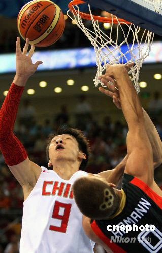 中國隊的后衛(wèi)孫悅嚴(yán)防德國隊中鋒哈曼的扣籃。