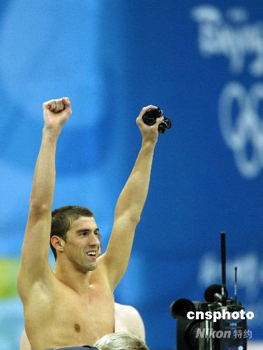 8月17日,美國(guó)隊(duì)獲得北京奧運(yùn)會(huì)男子4乘100米混合泳接力冠軍,至此,23歲的美國(guó)游泳運(yùn)動(dòng)員菲爾普斯不僅用8金刷新了單屆奧運(yùn)會(huì)金牌紀(jì)錄,而且還將個(gè)人所有奧運(yùn)會(huì)的金牌總數(shù)提高到了14枚,達(dá)成了他人難以超越的“世界紀(jì)錄”。 中新社發(fā) 杜洋 攝