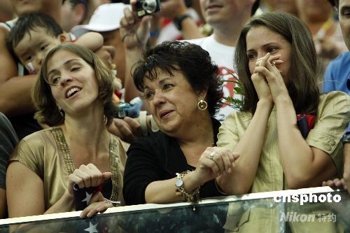 圖為菲爾普斯的媽媽黛比(中)和姐姐在看臺上為菲爾普斯加油助威。