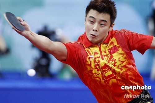 8月18日,北京奧運會乒乓球男子團體決賽在北京大學(xué)體育館舉行,王皓將為中國隊打頭陣,戰(zhàn)勝德國隊的新秀奧恰洛夫,為中國隊拿下第一分。中新社發(fā) 盛佳鵬 攝