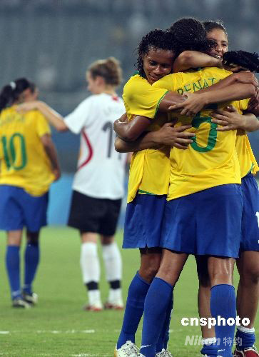 8月18日,北京奧運(yùn)會(huì)女足半決賽,德國(guó)對(duì)陣巴西的比賽在上海體育場(chǎng)進(jìn)行。最終,巴西隊(duì)以4:1戰(zhàn)勝德國(guó)隊(duì)晉級(jí)決賽。 中新社發(fā) 湯彥俊 攝