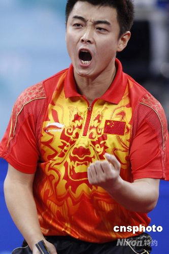 8月18日,2008年北京奧運(yùn)會(huì)乒乓球男團(tuán)決賽中國(guó)隊(duì)與德國(guó)隊(duì)的較量在北京大學(xué)體育館展開(kāi),中國(guó)隊(duì)?wèi){借著王皓、馬琳和王勵(lì)勤的出色表現(xiàn),以3比0擊敗德國(guó)隊(duì)奪冠。為中國(guó)代表團(tuán)贏得第39枚金牌。中新社發(fā) 盛佳鵬 攝