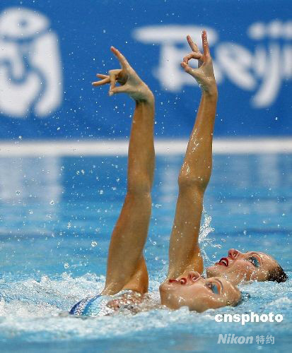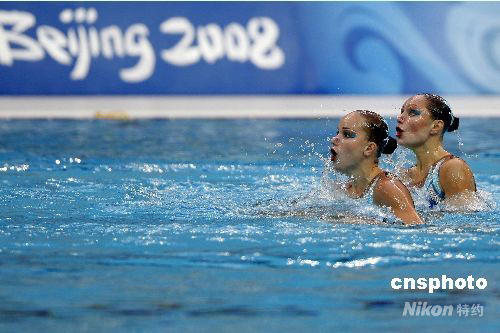 8月19日,2008北京奧運(yùn)會(huì)花樣游泳雙人自由自選預(yù)賽在國家游泳中心“水立方”進(jìn)行。衛(wèi)冕冠軍俄羅斯組合達(dá)維多娃/葉爾馬科娃以98.834的總分遙遙領(lǐng)先排名首位。 中新社發(fā) 杜洋 攝