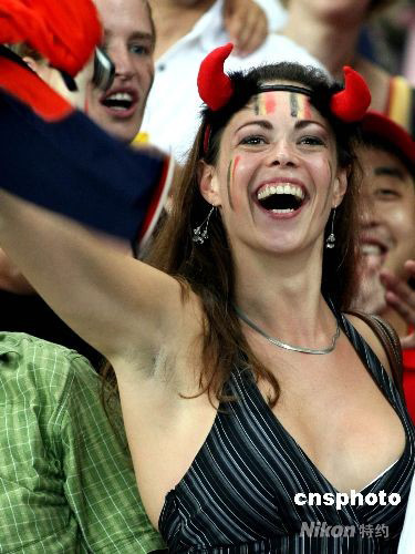 8月19日,北京奧運(yùn)會(huì)男足半決賽,尼日利亞與比利時(shí)的比賽在上海體育場(chǎng)進(jìn)行。一位比利時(shí)女球迷在觀(guān)眾席上激情助威,吸引現(xiàn)場(chǎng)觀(guān)眾的目光。 中新社發(fā) 湯彥俊 攝
