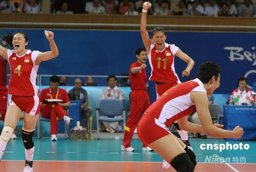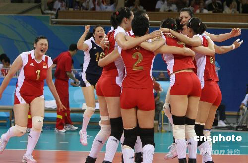8月19日晚,中國女排在奧運會四分之一決賽中,以3:0戰(zhàn)勝俄羅斯晉級四強,隊員歡慶勝利。 中新社發(fā) 武仲林 攝