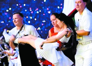 圖為開幕式上三位波蘭朋友在救助中國女孩。