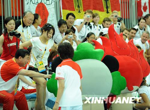 8月19日,中國選手郭晶晶在觀看比賽前和福娃合影。當日,北京奧運會跳水比賽在國家游泳中心——“水立方”繼續(xù)進行,何沖在男子3米跳板決賽中獲得冠軍。 新華社記者趙鵬攝