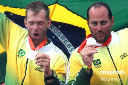 8月21日,2008奧運帆船比賽在青島分賽場進行最后一天比賽,在男子龍骨艇-星級-獎牌輪比賽中,巴西組合羅伯特·沙伊特/布魯諾·普拉達獲得銀牌。 中新社發(fā) 趙振清 攝