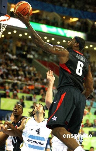 8月22日晚,北京奧運(yùn)會(huì)男子籃球半決賽第二場(chǎng)比賽在五棵松籃球館開(kāi)戰(zhàn),志在奪冠的美國(guó)“夢(mèng)八隊(duì)”遭遇雅典奧運(yùn)會(huì)冠軍阿根廷隊(duì),最后以101比81獲勝,進(jìn)入決賽。“夢(mèng)八隊(duì)”將與西班牙隊(duì)爭(zhēng)奪本屆奧運(yùn)會(huì)的男籃金牌。中新社發(fā) 任晨鳴 攝