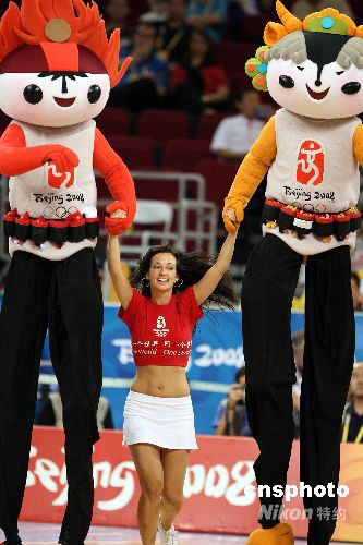 北京奧運(yùn)會(huì)男子籃球半決賽8月22日晚在五棵松籃球館開戰(zhàn),深受各國(guó)觀眾喜愛的北京奧運(yùn)會(huì)吉祥物“福娃”表演踩高蹺為比賽助陣。中新社發(fā) 任晨鳴 攝