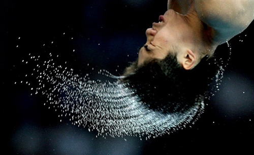 8月23日,中國選手火亮在北京奧運(yùn)會男子10米跳臺比賽中,做空中旋轉(zhuǎn)時甩出了美麗的水花。