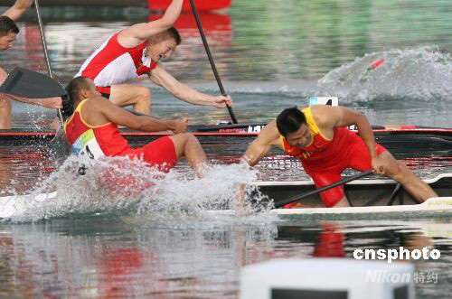 8月23日下午,在順義奧林匹克水上公園舉行的北京奧運(yùn)會(huì)皮劃艇靜水男子雙人劃艇500米決賽中,經(jīng)過(guò)激烈爭(zhēng)奪,上屆奧運(yùn)會(huì)冠軍、中國(guó)選手孟關(guān)良/楊文軍以1分41秒025的成績(jī)成功衛(wèi)冕,為中國(guó)皮劃艇隊(duì)奪得北京奧運(yùn)會(huì)上的唯一一枚金牌,也是中國(guó)代表團(tuán)本屆奧運(yùn)會(huì)奪取的第48塊金牌。俄羅斯組合與德國(guó)組合分別以1分41秒282和1分41秒964分獲二、三名。中新社發(fā) 武仲林 攝
