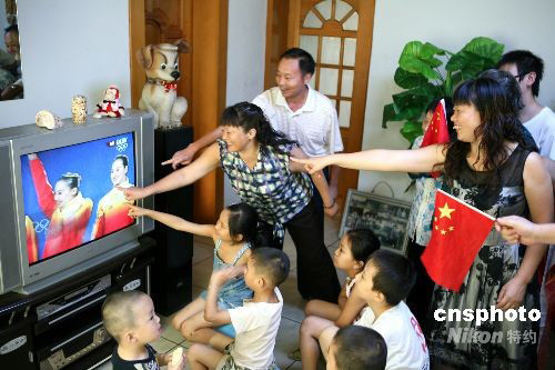 8月23日,四川閬中古城書院街一幢居民樓內(nèi),中國花樣游泳隊選手王娜的親朋圍在電視機旁觀看北京奧運會花樣游泳集體自由自選決賽。當(dāng)日,中國花樣游泳隊奪得團體自由自選銅牌,這是她們在奧運會歷史上獲得的首枚獎牌。
