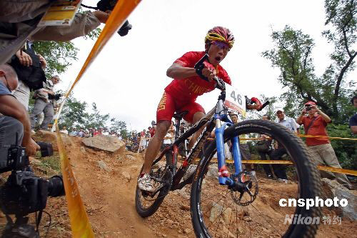 8月23日,在北京老山山地自行車場進行的奧運會男子自行車越野賽中,中國選手姬建華名列第22位。中新社發(fā) 盛佳鵬 攝