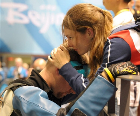 賽場(chǎng)上,埃蒙斯最后一槍僅打出4.4環(huán),到手的冠軍拱手相送。失落的埃蒙斯走到妻子的面前,這位射落本屆奧運(yùn)會(huì)首金的捷克女神槍手,捧起丈夫的臉,輕輕地摩挲,用深情的注視和呢喃來(lái)安慰他……,就像卡特琳娜奪金之后與丈夫深情一吻一樣,這一刻也給觀眾留下了深刻而溫馨的印象。