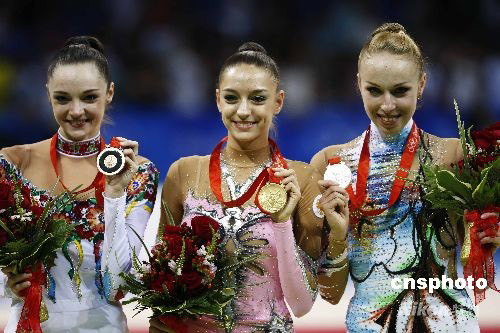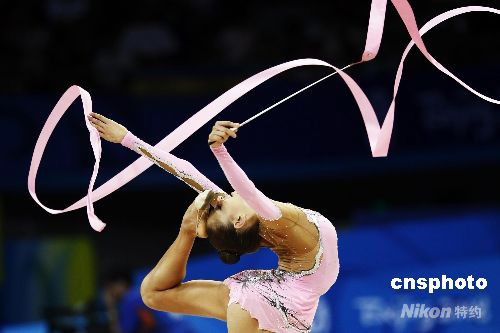 8月23日晚,在北京工業(yè)大學(xué)體育館舉行的北京奧運(yùn)會(huì)藝術(shù)體操個(gè)人全能決賽中,俄羅斯選手葉夫根尼婭·卡納耶娃以出色的表現(xiàn)獲得冠軍。