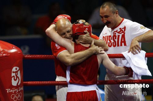 8月24日,在北京奧運(yùn)會(huì)拳擊比賽男子輕量級(jí)(60公斤級(jí))決賽中,俄羅斯選手阿列克謝·季先科(紅)戰(zhàn)勝法國選手達(dá)烏達(dá)·索夫贏得冠軍。 中新社發(fā) 盛佳鵬 攝