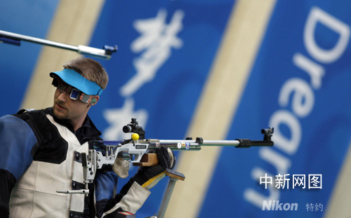 美國神槍手埃蒙斯因為自創(chuàng)的“歪把槍”法,最后一槍再次射偏“夢想”,繼雅典奧運會后,又再次拱手讓出只要正常發(fā)揮就“唾手可得”的男子50米步槍三種姿勢金牌。 中新社發(fā) 盛佳鵬 攝