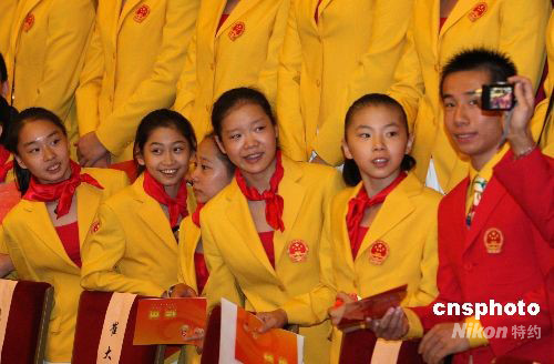 8月26日,2008年北京奧運會中國體育代表團總結(jié)大會在北京人民大會堂金色大廳舉行。女子體操運動員參加北京奧運會中國體育代表團總結(jié)大會。 中新社發(fā) 廖文靜 攝