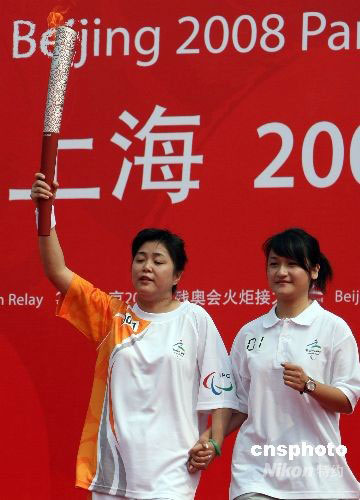 九月一日,北京殘奧會火炬接力“時代風(fēng)采線”第三站傳遞活動,在上海松江新城大學(xué)園區(qū)進(jìn)行,共有六十名火炬手參加。其中,殘疾人員10名,其余為助殘、幫殘的先進(jìn)代表和基層殘疾人事業(yè)工作者。圖為上海首枚殘奧會金牌獲得者趙繼紅(左)擔(dān)任第一棒火炬手。 中新社發(fā) 湯彥俊 攝