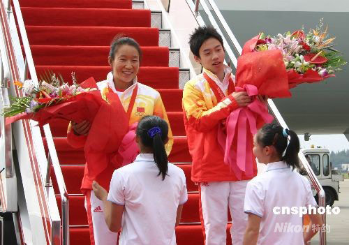9月3日15時30分,北京奧運會冠軍鄒凱、殷劍在家鄉(xiāng)人民的熱烈歡迎中回到了四川。在2008北京奧運會上,來自四川瀘州的鄒凱勇奪自由體操、單杠、男子體操團體三枚金牌,來自涼山的殷劍為中國代表團拿下了第一枚奧運會帆船金牌。中新社發(fā) 霍潺 攝