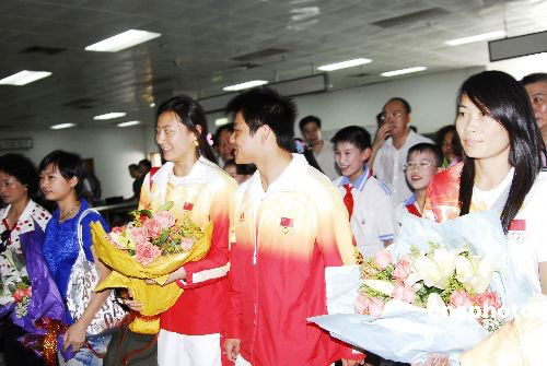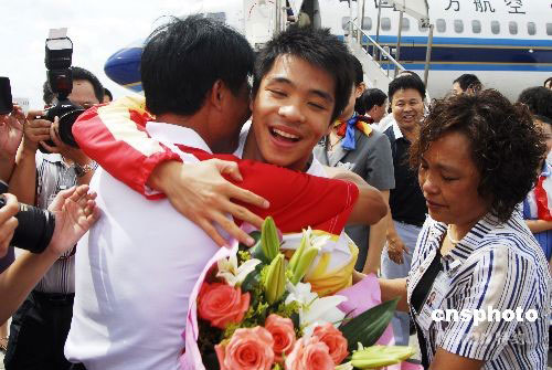 9月4日,剛參加完第29屆奧運會廣東省總結表彰會的湛江籍奧運冠軍何沖等飛抵湛江,受到湛江市政府和父老鄉(xiāng)親的熱烈歡迎。當日上午,何沖母!拷械谒男W、赤坎區(qū)業(yè)余體育學師生代表和他的親朋好友,到湛江機場迎接何沖的歸來。同期抵湛江的還有湛江籍北京奧運季軍、國家花樣游泳隊隊員劉鷗,國家女足運動員謝彩霞以及湛江籍運動健兒張小冬和上屆奧運冠軍勞麗詩等,他們于當天下午參加了湛江市的慶功表彰大會,湛江市授予何沖湛江市勞動模范稱號;湛江市總工會授予劉鷗和謝彩霞“五一勞動獎章”稱號;共青團湛江市委授予劉鷗“湛江市模范共青團員”稱號,謝彩霞“湛江市模范青年崗位能手”稱號;湛江市婦聯(lián)授予劉鷗和謝彩霞“三八紅旗手”稱號。中新社發(fā) 李滿青 攝