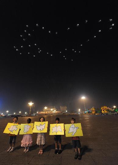 9月6日,來自中國、喀麥隆、以色列、巴基斯坦和愛爾蘭(從左到右)的小朋友舉起和平鴿圖片與天安門上空的和平鴿造型焰火遙相呼應。當日,北京2008年殘奧會開幕式在國家體育場隆重舉行。新華社記者 王小川 攝