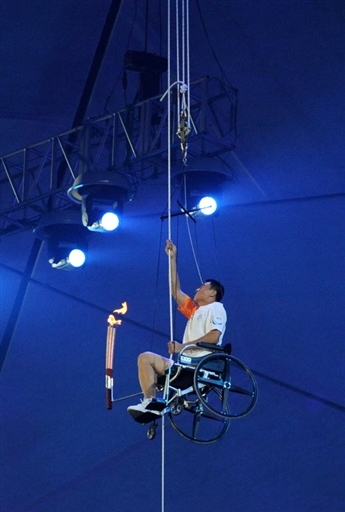 9月6, 北京殘奧會開幕式在北京國家體育場隆重舉行,殘疾人跳高運動員侯斌點燃殘奧會圣火主火炬臺。