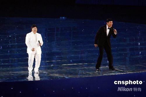 9月6日晚,北京2008年殘奧會(huì)開幕式在國家體育場(chǎng)“鳥巢”舉行,圖為歌手劉德華(右)、韓紅在開幕式上演唱?dú)垔W會(huì)主題歌《和夢(mèng)一起飛》。 中新社發(fā) 盛佳鵬 攝
