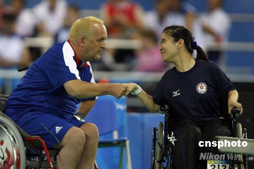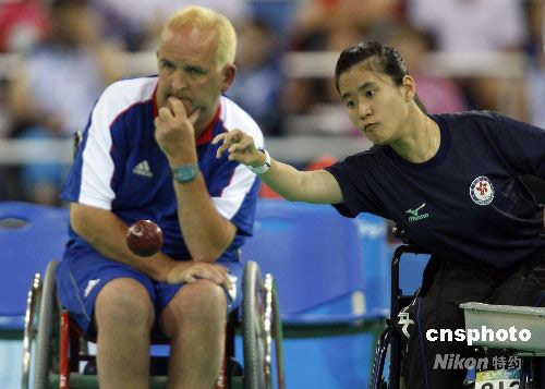 9月9日,中國香港選手郭海瑩在硬地滾球混合單打-BC2決賽中,戰(zhàn)勝英國選手奈杰爾-莫里,為中國香港隊摘得殘奧會首枚金牌。中新社發(fā) 杜洋 攝