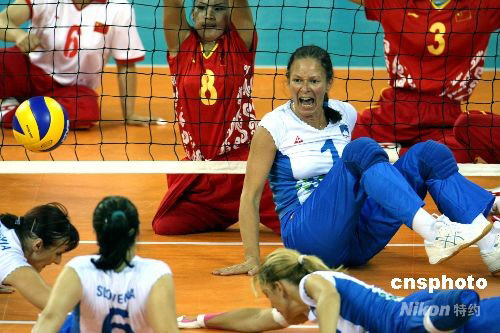 北京殘奧會(huì)坐式排球女子半決賽9月12日在北京農(nóng)業(yè)大學(xué)體育館舉行,中國(guó)女隊(duì)以3比0橫掃斯洛文尼亞闖進(jìn)決賽,將與美國(guó)女隊(duì)爭(zhēng)奪冠軍。中新社發(fā) 任晨鳴 攝