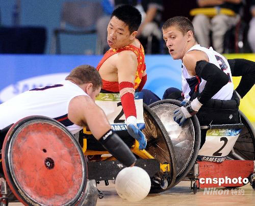 9月12日,殘奧會輪椅橄欖球比賽在北京科技大學(xué)體育館開賽,揭幕戰(zhàn)中國隊(duì)以30-65不敵世界排名第一的美國隊(duì)。剛剛組建一年的中國隊(duì)雖然戰(zhàn)敗,但始終面對微笑頑強(qiáng)拼搏永不言棄的球員們卻贏得了滿堂喝彩,贏得了包括美國隊(duì)在內(nèi)的各方交口稱贊。中新社發(fā) CNAsports_p 攝