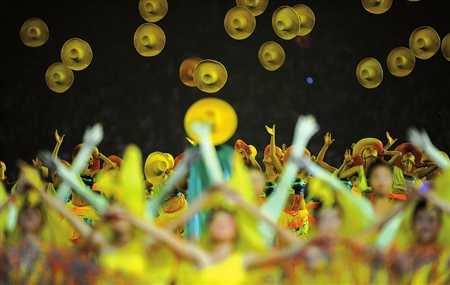 “歡慶篇章”是整臺晚會“寄給未來的一封信”的壓軸戲,而“草帽舞”是“歡慶”中的高潮部分、晚會的亮點之一。昨晚草帽舞華麗登場時,成都的姑娘們從舞臺的左臺口向舞臺的右底角走“斜線一字”,動作整齊,節(jié)奏分明,邊行進邊傳遞草帽,她們的隊列沉穩(wěn)舒緩,時圓時方,變化萬千。到達鳥巢中間時,草帽突然像金色的花朵,從演員手中快速飛出,在空中彼此飛舞,宛如向日葵花簇簇綻放,蔚為壯觀。而在草帽舞隊的四周,還有兩千多人輔以奔放灑脫的舞蹈表演。此時鳥巢內(nèi)已是掌聲雷動,歡呼陣陣。整個節(jié)目傳遞的是青春、是快樂,是少女的激情與奔放,是自由與陽光,是未來的希望,表演服飾也以紅黃為主調(diào),大紅艷麗,大黃成熟,直奔歡慶主題。成都的姑娘們退場后激動地說,她們的自信和當晚的演出成功,離不開奧組委領(lǐng)導的關(guān)心支持。據(jù)悉,這批專業(yè)演員全部由成都市文化藝術(shù)學校的專業(yè)舞蹈學生、演員和舞蹈教師組成。(周帥)