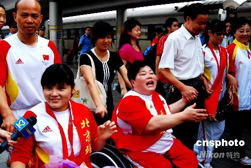 9月21日早上8點30分左右,從北京駛向南昌的Z67次列車?磕喜九_,江西省參加北京殘奧會的3名運動員凱旋而歸。許多市民手捧鮮花、手舉紅旗來到現(xiàn)場夾道迎接運動員。中新社發(fā) 胡國林 攝