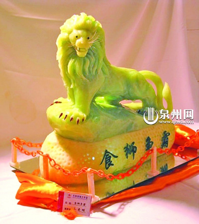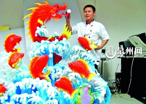 “飛天迎賓”、“鯉魚化龍”“東方醒獅”、“渡海觀音”等我(泉州)市各縣(市、區(qū))一些群眾熟悉的城市標(biāo)志,它們多為石頭、瓷、銅器等硬物雕刻而成。然而,在石獅某酒店中,“80后”的食雕師朱愛明,則用各種食品或泡沫雕成這些標(biāo)志,成為宴席上的亮點(diǎn)。