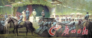 對于潘嘉俊來說,他的黃埔情結似乎更加濃烈些,21年的軍旅生涯讓他對軍事題材的創(chuàng)作格外有激情,“我熟悉黃埔軍校,并畫過有關的連環(huán)畫、單幅油畫和肖像畫”,他說,至今尚未出現(xiàn)一幅表現(xiàn)黃埔軍校歷史的大型美術作品,同時,“人們記憶中關于閱兵的場景作品也極少”,因此,“另辟蹊徑、獨樹一幟”成為潘嘉俊選題的立意。