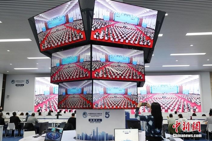 媒體記者在新聞中心觀看第五屆進(jìn)博會(huì)開(kāi)幕式
