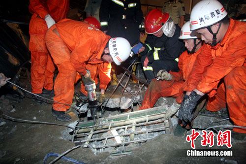隨著救援進(jìn)程在加快,一塊塊阻礙救援的鋼筋混凝土樓板和房梁被移開。“利用液壓支撐工具把樓板撐起來,夾縫里有人!”為避免現(xiàn)場再次塌落,救援官兵利用液壓支撐工具把三樓樓板撐起來。21時(shí)55分,消防官兵在現(xiàn)場北面搜又救出1名被埋人員。