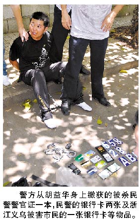 胡益華作案后十分殘忍冷血,殺人后還不忘搜索受害者身上有價值的物品,以便攜帶潛逃。據(jù)警方通報,胡益華歸案后,除了從他身上搜出槍支外,還從他身上搜出廣東被殺民警警官證一本,民警的銀行卡兩張及浙江義烏被害市民的一張銀行卡。