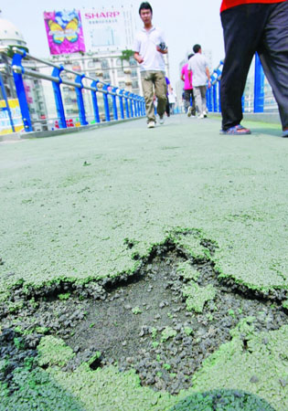 記者問:天橋剛修成僅一個多月,為何會出現(xiàn)大面積破損現(xiàn)象。張成立說,該路段交通異常擁堵,天橋工期趕得非常緊!坝捎谛腥艘^橋,影響了施工,所以上面本來要噴的一層固化膠就缺少了,以致地墊黏合性差,F(xiàn)在,我們要在上面再噴固化膠!