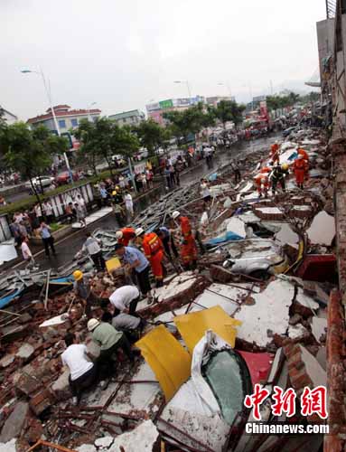 今天下午4點45分,記者趕到現(xiàn)場。發(fā)生事故是巨桑國際家居博覽中心一幢兩層高的樓房,樓房頂部還架有大型廣告牌,此時該樓房已有約50米長的外墻倒塌,現(xiàn)場已經(jīng)設置起警戒,公安、消防、醫(yī)院等部門的救援人員及巨桑工作人員等近百人正在倒塌現(xiàn)場全力展開搜救工作,衢州市及柯城區(qū)有關領導也已趕到現(xiàn)場。
